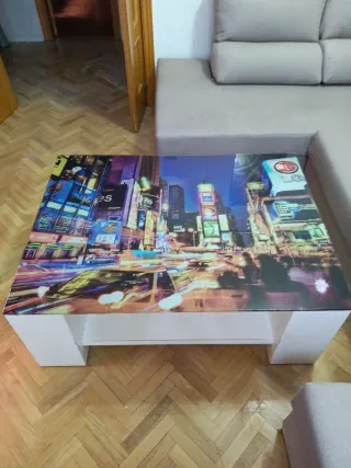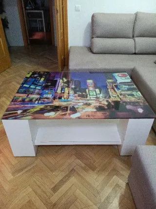 Elegante mesa de centro con un diseño vibrante que evoca la energía de una ciudad. - Superficie con impresión digital de alta calidad. - Base blanca y robusta. - Diseño moderno y llamativo. Medidas 1,20x90