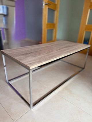 Elegante mesa de centro con un diseño moderno. - Tablero de madera con acabado natural en melamina. - Estructura metálica en color cromado. - Esta completamente nueva sin estrenar ya que dispongo de otra similar. - Medidas son 110cm de largo, 50cm de ancho y 40cm de alto.