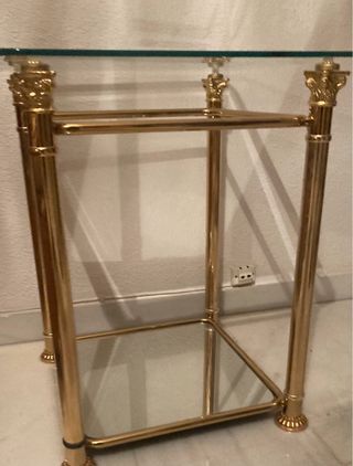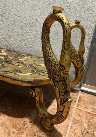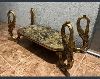 (( Posibilidad de entrega en cualquier punto del trayecto Ciudad Real - Madrid o del trayecto Ciudad Real-Alicante )) Elegante mesa auxiliar con un diseño único. Con su cristal de encima. Medidas de la Mesa sin el cristal : 85 cm de ancho, 40 cm de alto y 37 cm de fondo. Medidas del Cristal: - Acabado metálico en tono dorado. - Patas con forma de cisne detalladas. - Superficie con ornamentación labrada.