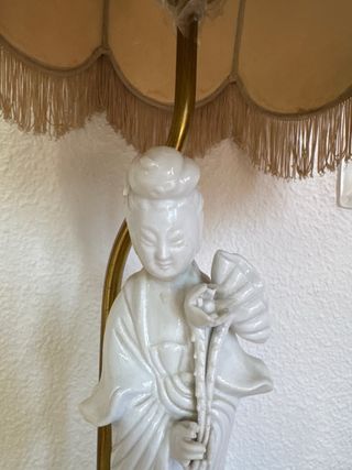 Elegantes lámparas de mesa con una figura central. - Base de madera. - Figura de porcelana detallada. - Pantalla de tela con flecos. No se hacen envios
