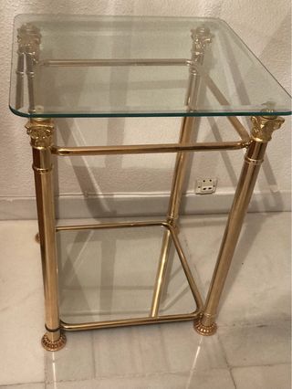 Elegante mesa auxiliar con un diseño moderno y sofisticado. - Tablero superior de cristal transparente. - Estructura y patas de metal con acabado dorado. - Estante inferior de cristal. - Detalles ornamentales en las patas.