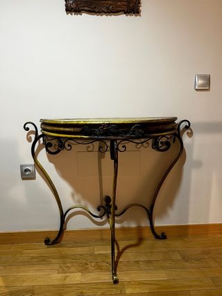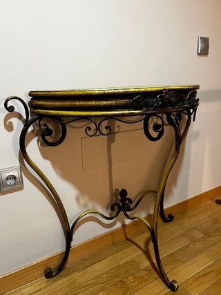 Elegante mesa de consola o recibidor con un diseño clásico. - Estructura de metal con detalles dorados. - Patas curvas con adornos.