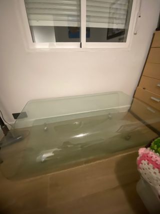 mesa baja de centro para sofas muy bonita moderna y elegante de cristal con cuatro ruedas. en buen estado solo tiene un piquete en una esquina que casi no se aprecia, de ahi su precio. medidas 120cm de ancho por 70 de fondo por 40 de alto.