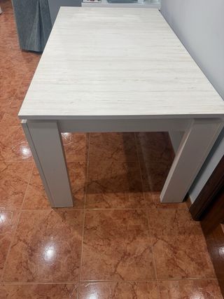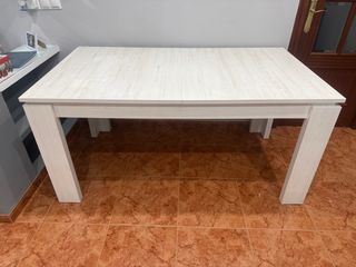 Mesa de salón con un diseño moderno y elegante. - Acabado en madera con vetas blancas. - Patas robustas para mayor estabilidad. - Mesa extensible - La mesa esta en perfecto estado, lo unico que tiene es una pata un poco bufada por abajo, como se muestras en la imagen. - Medidas: - Largo - 1,60 y 2m abierta - Ancho - 90 - Alto - 76,5