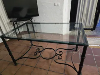 Elegante mesa con estructura de forja y sobre de cristal. - Medidas: 140 cm de largo x 80 cm de ancho. - Diseño clásico con detalles ornamentales en la base.