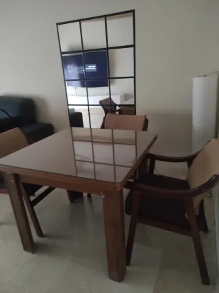 Conjunto de cuatro sillas sin asiento, junto con una mesa extensible. La mesa como se puede apreciar en la foto, es de 1 pie y tiene por algún lado el barníz saltado. Proceden todas de la misma compra. Proporciono también plantilla de madera para el asiento. El estado de los muebles es bastante aceptable. Se puede vender por separado (las 4 sillas o la mesa). - Estructura de madera. - Color marrón.