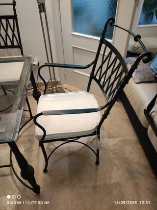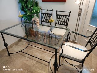 Conjunto de mesa y sillas de forja artesanal con un diseño elegante. - Mesa con sobre de cristal. - Sillas con asientos acolchados.