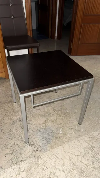 Mesa auxiliar con un diseño moderno y funcional. - Tablero de madera oscura. - Patas y estructura de metal plateado.