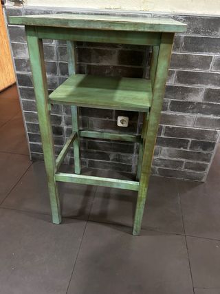 Conjunto de mesa alta y taburete con acabado verde desgastado. - Diseño de estilo vintage. - Ideal para espacios pequeños o como mueble auxiliar.
