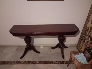 Elegante mesa de madera con un diseño clásico y funcional. Su acabado le da un toque sofisticado a cualquier espacio. - Tablero con bordes redondeados. - Base con dos soportes ornamentados. - Patas curvadas para mayor estabilidad.