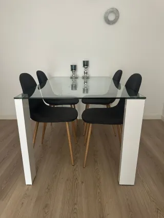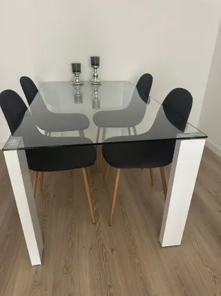 ⭐!SUPER OFERTA MESA/COMEDOR + 4 SILLAS !⭐ Perfecta para aquellos que buscan una opcion moderna y sofisticada para su hogar, tiene un diseño cuadrado con tapa de cristal templado que crea un ambiente luminoso y fresco, mientras que las patas de madera proporcionan un toque de calidez y elegancia. Las 4 sillas incluidas en el conjunto estan hechas con materiales de alta calidad. Medidas Mesa: Alto: 70 cm Ancho: 100 cm Largo: 100 cm Envío a domicilio (consulte tarifas) - Pago contra reembolso - Garantía de 3 años ⭐!NO ESPERES MAS PARA TENER TU NUEVO COMEDOR + 4 SILLAS EN TU HOGAR ⭐ 📲*670222602*📲 JHON!⚡