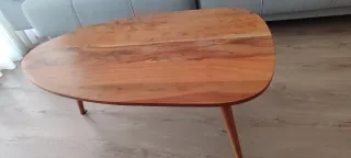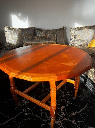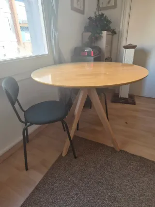 Mesa de comedor redonda (cerrada) y ovalada (abierta) con un diseño clásico y patas torneadas. Acabado en madera clara, diseño extensible para mayor versatilidad. Tiene tiempo de uso durante años pero sigue siendo funcional. Las medidas son 75 cm de alto, 80 cm de fondo y ancho cuando está cerrada, y 80 cm de fondo y 110 cm de ancho cuando está abierta.