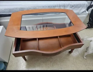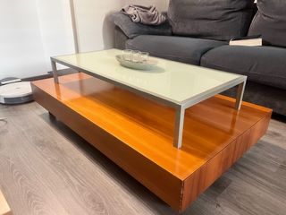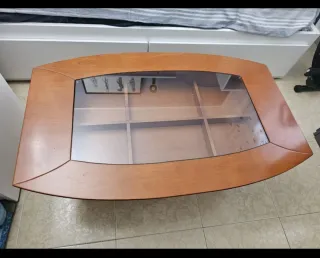 Elegante mesa de centro con base de madera de cerezo y superficie de cristal. - Diseño moderno y funcional. - Combinación de materiales que aportan calidez y luminosidad.
