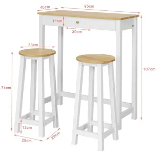 Conjunto de mesa alta con dos taburetes. - Diseño moderno y funcional. - Acabado en madera y blanco.
