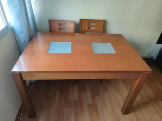 mesa de comedor de 120x90 con sobre de cristal y estructura en acabado wengue. Extensible a 120 a 180 con tablero madera y 120 a 240 en cristal. Tiene desgaste de uso como se aprecia en la foto - Tablero de cristal y madera - Base de madera en tono wengue.