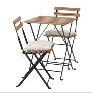 Conjunto de mesa y dos sillas de exterior de la serie Tarno de Ikea. Ideal para balcones o terrazas pequeñas. - Estructura metálica negra. - Tablero y asientos de madera. - Incluye cojines blancos para las sillas.