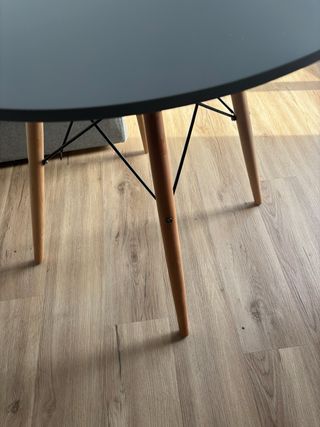 Mesa redonda de comedor con un diseño moderno y patas de madera. - Tablero de madera. - Patas de madera. - Tiene algún pequeño arañazo de gato.