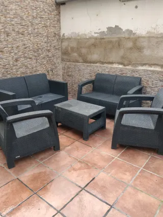 Conjunto de muebles de exterior ideal para tu terraza o jardín. Incluye dos sofás de dos plazas y dos sillones individuales, además de una mesa auxiliar. - Dos sofás de dos plazas. - Dos sillones individuales. - Mesa auxiliar a juego.