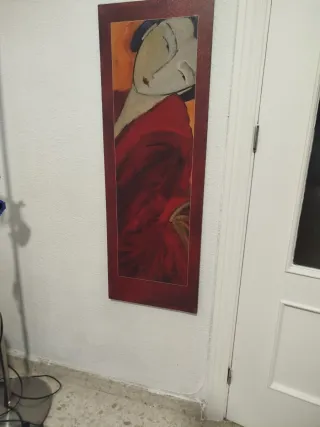 Elegante mesa de centro con un diseño moderno y funcional. Se acompaña de cuadro moderno en tonos rojos. - Estante inferior para almacenamiento adicional. - Cajón integrado para guardar objetos. - Acabado en madera oscura.