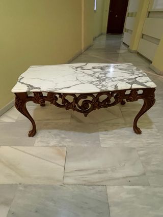 Elegante mesa de centro con un diseño único, elaborada por un ebanista. - Tablero de mármol con veteado natural. - Base y patas de madera tallada artesanalmente.