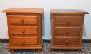Conjunto de dos mesitas de noche de madera, con tres cajones cada una. Diseño clásico y funcional. Fáciles de pintar con el color deseado. - Tiradores redondos. - Patas redondeadas.