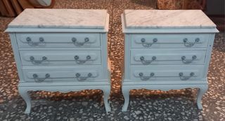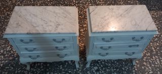 Conjunto de dos mesitas de noche con un elegante diseño. - Encimera de mármol. - Estructura de madera. - Cajones con tiradores decorativos.
