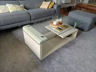 Mesa de centro con un diseño moderno y funcional. - Superficie superior de cristal. - Base en acabado blanco/beige brillante. -Anch 60 cm Largo 120 cm -En buen estado. -Recoger en Donosti. No envío.