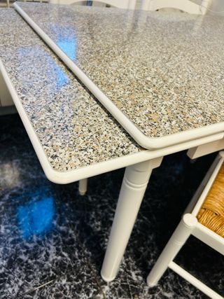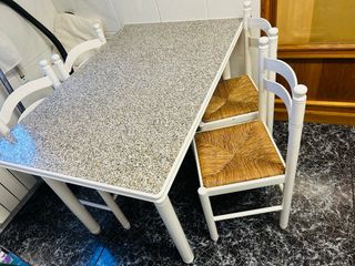 Conjunto de mesa extensible de cocina con cuatro sillas. - Mesa con sobre de imitación granito. - Sillas con asiento de mimbre. Esta en buen estado, mas sillas siempre se usaron con cojines
