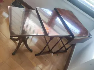 Conjunto de tres mesas apilables de madera. - Diseño elegante y funcional. - Perfectas para ahorrar espacio.