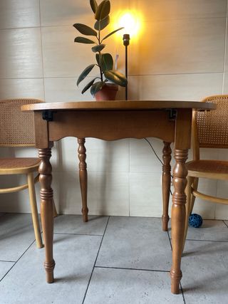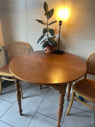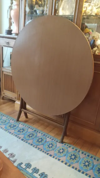 Mesa antigua redonda de madera con patas plegables maciza. El tablero es de otra calidad a las patas más ligero . Tiene mucha estabilidad y resistencia. - Diseño circular. - Estructura de madera. - Color marrón. Ideal para casas pequeñas ya que te permite guardarla detrás de una puerta y sin embargo tiene mucha capacidad para comer 6 comensales sin ocupar sitio extendida y la tienes recogida . Fácil de plegar sin esfuerzos y medidas estándar de una mesa normal de comedor sin molestar y quitar sitio. Recoger en domicilio .