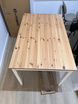 Mesa de comedor de Maisons du Monde: Tiene varias marcas en las esquinas y algunos rayones en la tabla. 150x80 75 cm de alto Se entrega desmontada pero el montaje es muy sencillo. Mesa de centro de LOLAhome: La madera está en buen estado aunque tiene alguna pequeña marca 100x50 36,5 cm de alto Se entrega montada Se venden también por separado aunque priorizo compra conjunta