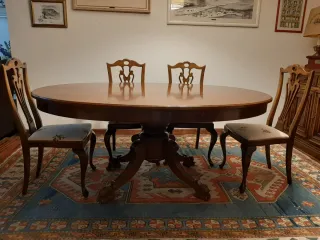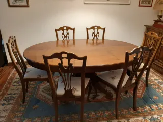 Conjunto de mesa de comedor ovalada de madera maciza, con seis sillas a juego de diseño clasico. En caso de que se quiera, se vende también con 6 sillas tapizadas. La mesa está en muy buen estado, las sillas están más gastadas. - Mesa con base central de madera. - Sillas con asientos tapizados. - Gran peso. Para recoger a finales de abril. La mesa se entrega en la casa, sacarla a la calle es a cuenta del comprador. Hay unos 30 escalones.