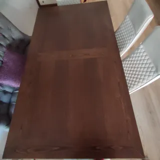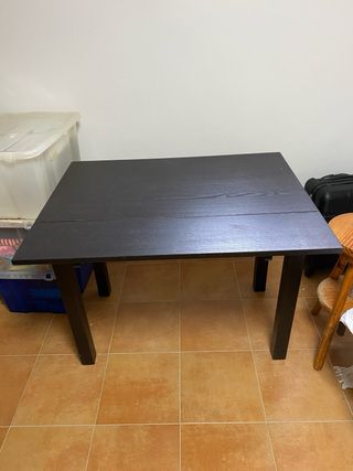 Mesa de comedor extensible, fuerte y muy util. Puede deslizar fácilmente las partes extendidas de ambos lados hacia adentro y hacia afuera. Es una mesa perfectamente utilizable en 3 tamaños. Adentro es 90x50cm. Cada parte/lado extensible es 25cm - entonces 1 lado afuera: 90x75 y 2 lados afuera: 90x100cm - Acabado en madera oscura. - Estructura robusta y duradera.