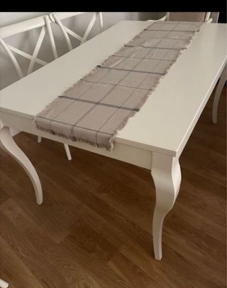 Elegante mesa de comedor con un diseño moderno y patas isabelinas. - Color principal: blanco roto. - Patas de madera con un diseño curvo.