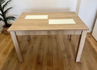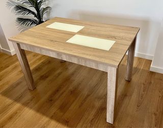 Mesa de comedor con un diseño moderno y funcional. Su acabado combina madera con detalles de cristal con fondo blanco. - Acabado en tonos blanco y marrón. - Superficie con inserciones de cristal. - Estructura principal de madera. La mesa mide 120x80cm, pero se puede extender a 160x80cm.