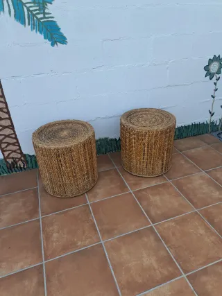 Conjunto de dos mesas auxiliares redondas, perfectas para añadir un toque natural a tu hogar. - Material tejido a mano. - Diseño cilíndrico.
