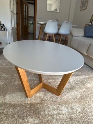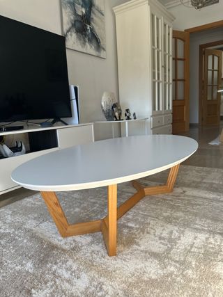 Elegante mesa de centro ovalada para el salón. Su diseño moderno combina una superficie blanca con una base de madera. - Forma ovalada. - Acabado de la tapa en blanco. - Base con estructura de madera.