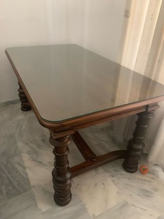 Elegante mesa de centro con un diseño rústico y detalles tallados en madera. La superficie es de cristal. - Estructura de madera maciza. - Tapa de cristal. - Diseño tallado artesanal.