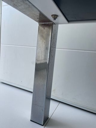Elegante mesa plegable con un diseño moderno y minimalista. - Superficie de cristal translúcido. - Estructura de metal resistente. - Ideal para espacios reducidos. - Las patas no están sucias, están algo oxidadas, por eso el precio es tan bajo, quitando eso funciona perfectamente - sin plegar de alto mide 48 cm