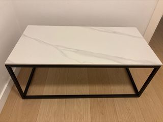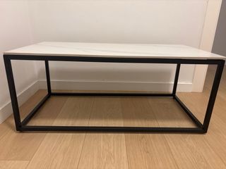 Mesa de centro de diseño moderno, sin usar y lista para darle un toque especial a tu salón. Sus dimensiones son 1 metro de largo por 40 cm de ancho. - Encimera con acabado imitación mármol blanco veteado. - Patas metálicas negras con diseño geométrico.