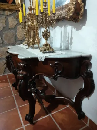 Elegante recibidor con un diseño clásico y sofisticado. Su combinación de materiales aporta un toque de distinción a cualquier espacio. - Encimera de mármol. - Base de madera tallada. - Acabado en tonos marrones _ Antigüedad de gran prestigio NO SE VENDE NI EL RELOG NI LOS CANDELABROS NI EL ESPEJO
