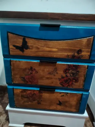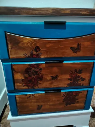 Conjunto de dos mesitas de noche restauradas con un diseño único. - Acabado exterior en azul vibrante. - Detalles decorativos de mariposas y rosas. - Cajones con superficie de madera natural. - Tiradores negros modernos.