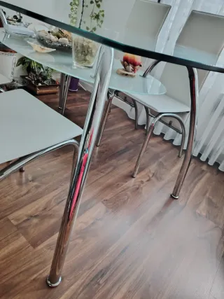 Conjunto de mesa con superficie de cristal y cuatro sillas de asiento blanco. - Mesa con estructura metálica. - Sillas con tapizado blanco,polipiel Medidas mesa: 150x90x75 Precio negociable algo lógico