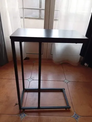 Mesa auxiliar con un diseño moderno y elegante, perfecta para complementar tu espacio. - Estructura robusta de metal. - Tablero de madera con acabado oscuro. - Medidas: 63.5cm(alto)x45cmx25cm. - Para apoyar un portátil o comer en el sillón.