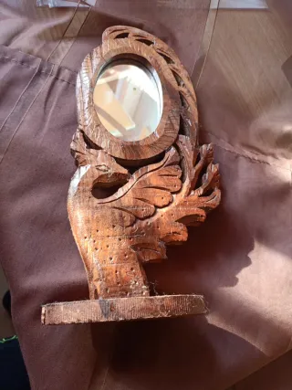 Este espejo de mesa presenta un diseño único y artesanal. El espejo tiene alguna manchas, se puede cambiar por otro o poner fotos. - Base de madera con detalles tallados. - Marco del espejo con motivos decorativos. - Tamaño compacto, ideal para tocador.