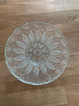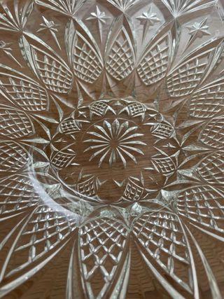 Elegante centro de mesa de cristal macizo con un intrincado diseño tallado. Aporta un toque de distinción a cualquier espacio. - Diseño floral central. - Borde festoneado. - Patrones geométricos. - Pieza decorativa.