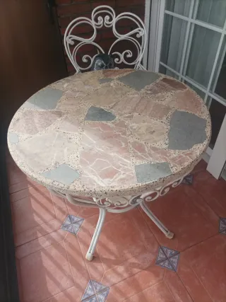 Mesa redonda de piedra y 4 sillas de metal