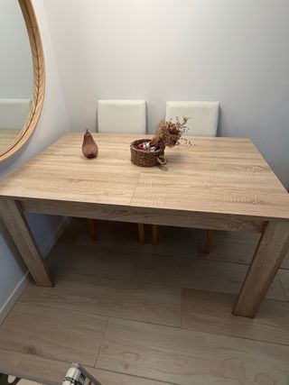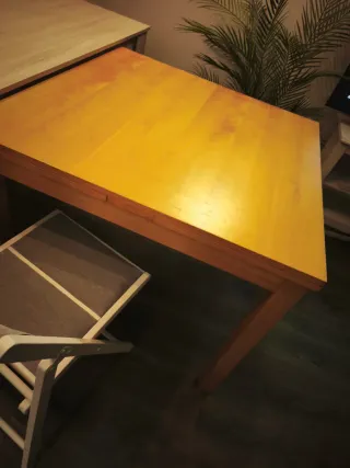 Mesa extensible de madera con un diseño moderno y funcional. Ideal para adaptar a diferentes espacios. - Tablero de madera con acabado natural. - Patas robustas para mayor estabilidad. -Medidas: 90x90 (170 extendida) -Marcas de uso (por eso el precio)