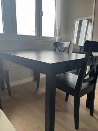 Conjunto de mesa extensible y cuatro sillas. Muy practica y con bastante cuerpo. Cuadrada: 90x90x76cm. Abierta: 90x180x76 - Mesa de madera con sistema extensible. - Incluye 4 sillas a juego.