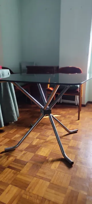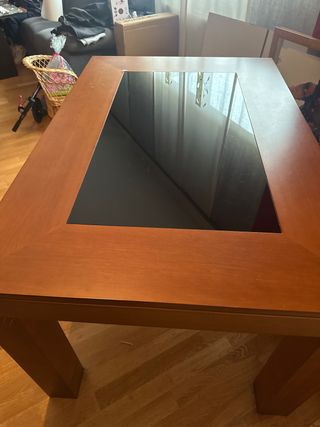 Elegante mesa de comedor con superficie de cristal y estructura de madera. - Diseño moderno y funcional. - Combina a la perfección con cualquier estilo de decoración. La mesa puede abrirse. A recoger en Getafe, en una cuarta planta sin ascensor.